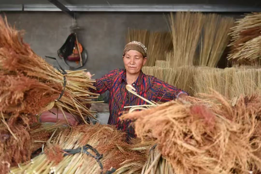 | لي ياومي، إحدى سكان قرية لونغيوان من منطقة هونغسي باو، تنسج مكنسة من نبات السويركي. |