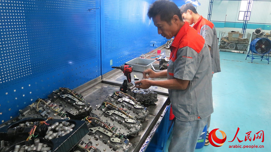 تقنيون بصدد صيانة قطع غيار السيارات بشركة تشونغ تشه الدولية لقطاع السيارات بهايكو