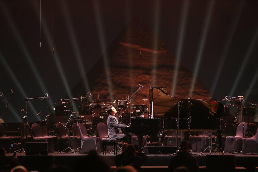 | عازف البيانو الصيني لانغ لانغ يعزف على البيانو خلال افتتاح مهرجان صدى الأهرامات في منطقة الأهرامات الخلابة في الجيزة، مصر، يوم 24 نوفمبر 2025. (شينخوا) |