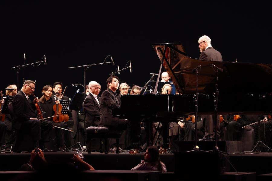| عازف البيانو الصيني لانغ لانغ يعزف على البيانو مع الأوركسترا الفيلهارمونية الملكية خلال افتتاح مهرجان صدى الأهرامات في منطقة الأهرامات الخلابة في الجيزة، مصر، يوم 24 نوفمبر 2025. (شينخوا) |