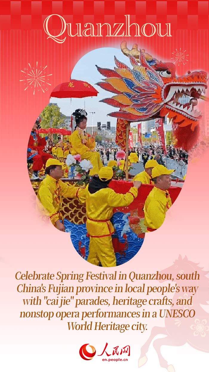 تُعد تشوانتشو من أكثر المدن سحرا وجاذبية لقضاء رأس السنة الصينية، حيث تمزج احتفالات عيد الربيع بين التقاليد العريقة والروح العصرية بأسلوب مينان الفريد (جنوب فوجيان). ومن أبرز فعاليات المدينة موكب "تشاي جيه" الشهير، وهو تقليد شعبي يعود إلى أسرتي سوي وتانغ، يجمع السكان بالغناء والرقص والاحتفال.