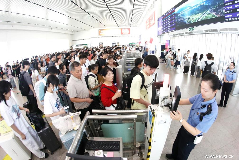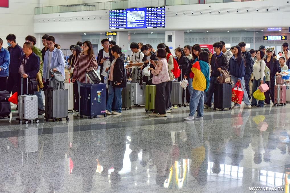 بكين 9 أكتوبر 2025 (شينخوا) في الصورة الملتقطة يوم 8 أكتوبر 2025، مسافرون في محطة ووشي للسكك الحديدية في مقاطعة جيانغسو بشرقي الصين، حيث تشهد البلاد ذروة رحلات الإياب للمسافرين مع انتهاء عطلة العيد الوطني وعيد منتصف الخريف يوم الأربعاء الماضي، والتي استمرت من الأول إلى الثامن من أكتوبر الجاري.